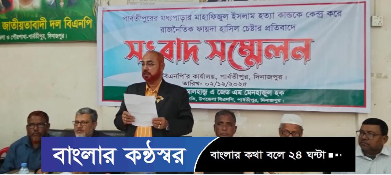 আজ মঙ্গলবার (২ ডিসেম্বর) বেলা ১১টায় উপজেলা বিএনপি দলীয় কার্যালয়লে অনুষ্ঠিত সংবাদ সম্মেলনে তিনি বলেন, এটি সম্পূর্ন রাজনৈতিক উদ্দেশ্য প্রনোদিত। বিগত আড়াই মাস পূর্বে পার্বতীপুর উপজেলার ১০নং হরিরামপুর ইউনিয়নের খাগড়াবন্দ কোটোয়াল পাড়া গ্রামে একটি হত্যাকান্ড সংঘটিত হয়। বিভিন্ন পত্রিকা, অনলাইন ও সোশ্যাল মিডিয়ার মাধ্যমে জানা যায় হত্যাকান্ডটি ঘটেছিল পরকীয়া প্রেমের জের ধরে। কিন্তু বর্তমানে একটি স্বার্থান্বেষী মহল রাজনৈতিক স্বার্থ হাসিলের উদ্দেশ্যে উক্ত হত্যাকান্ডে নিহত মাহাফিজুল ইসলামের ছেলে সজীব ইসলামকে ভুলভাল বুঝিয়ে প্ররোচিত করে তাকে দিয়ে উপজেলা বিএনপির সিনিয়র সহ-সভাপতি ও সাবেক পৌর মেয়র এজেডএম মেনহাজুল হক ও তার ভাই সংসদ সদস্য, পার্বতীপুর-ফুলবাড়ী (দিনাজপুর)-৫ আসনে মনোনয়ন প্রত্যাশী এজেডএম রেজওয়ানুল হককে জড়িয়ে মিথ্যা বানোয়াট ও ভিত্তিহীন কথা উল্লেখ করে জাতীয় প্রেসক্লাবে গত ৩০ নভেম্বর এক সংবাদ সম্মেলন করেন। তিনি তীব্র নিন্দা জ্ঞাপন করেন এবং প্রতিবাদ জানান। ভবিষ্যতে কোন ব্যক্তি বা গোষ্ঠীকে এ ধরনের ভূয়া মিথ্যা বানোয়াট তথ্য প্রকাশ না করার আহ্বান জানান। এসময় সংবাদ সম্মেলনে উপস্থিত ছিলেন, পার্বতীপুর উপজেলা বিএনপি সাংগঠনিক সম্পাদক মো: আকরাম হোসেন মাষ্টার, কোষাধ্যক্ষ সাবেক পৌর প্যানের মেয়র জাহাঙ্গীর আলম, দপ্তর সম্পাদক খয়রাত কাজি, উপজেলা জিয়া পরিষদের সভাপতি অধ্যাপক ফয়েজুর রহমান, সাধারন সম্পাদক অধ্যক্ষ আবু বক্কর সিদ্দিক, উপজেলা শ্রমিক দলের সভাপতি মনজুরুল আলম, পৌর বিএনপির সহ-সভাপতি ওমর ফারুক বাবলু, সহ-সাংগঠনিক সম্পাদক আবু এহিয়া, পৌর যুবদলের যুগ্ম আহবায়ক রেজাউল হকসহ যুবদল, ছাত্রদল, কৃষক দল স্বেচ্ছাসেবক দলের নেতৃবৃন্দ।