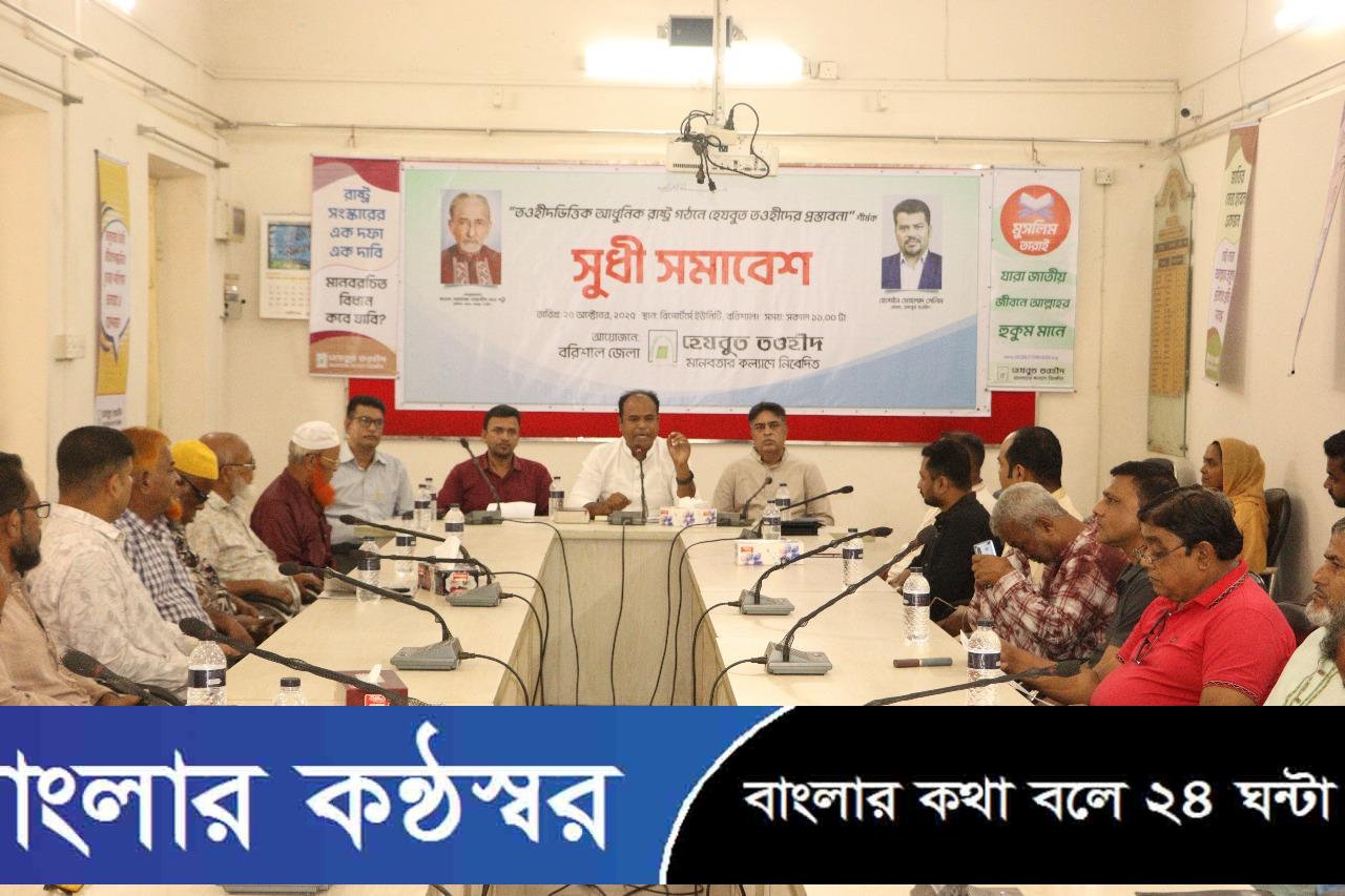 আল্লাহর হুকুমের ভিত্তিতে রাষ্ট্রব্যবস্থা সংস্কারের দাবি জানিয়ে বরিশালে সুধী সমাবেশ করেছে হেযবুত তওহীদ। শনিবার (২৫ অক্টোবর) সকালে বরিশাল রিপোর্টার্স ইউনিটিতে আয়োজিত এই সুধী সমাবেশে “তওহীদভিত্তিক আধুনিক রাষ্ট্রব্যবস্থা”-র প্রস্তাবনা তুলে ধরে সংগঠনটি।